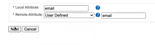 - In the Local Attribute field, type email to identify the attribute locally. From the Remote Attribute drop-down list, select User Defined. In the adjacent text box, type email, and then click Next.