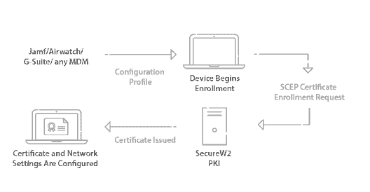For managed devices, many organizations with Okta use Microsoft’s MDM, Intune. SecureW2 integrates with Intune through our Gateway APIs. You can use the gateway to push policies and configuration settings onto Intune devices so they can auto-enroll themselves for 802.1x digital certificates automatically, and IT admins don’t need to lift a finger to get managed devices configured for 802.1x.