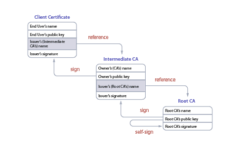 Trust is established through a chain (pictured below). You can trace the path from the client’s certificate back to a single root CA. This root CA is where all the trust for a PKI is ultimately derived.